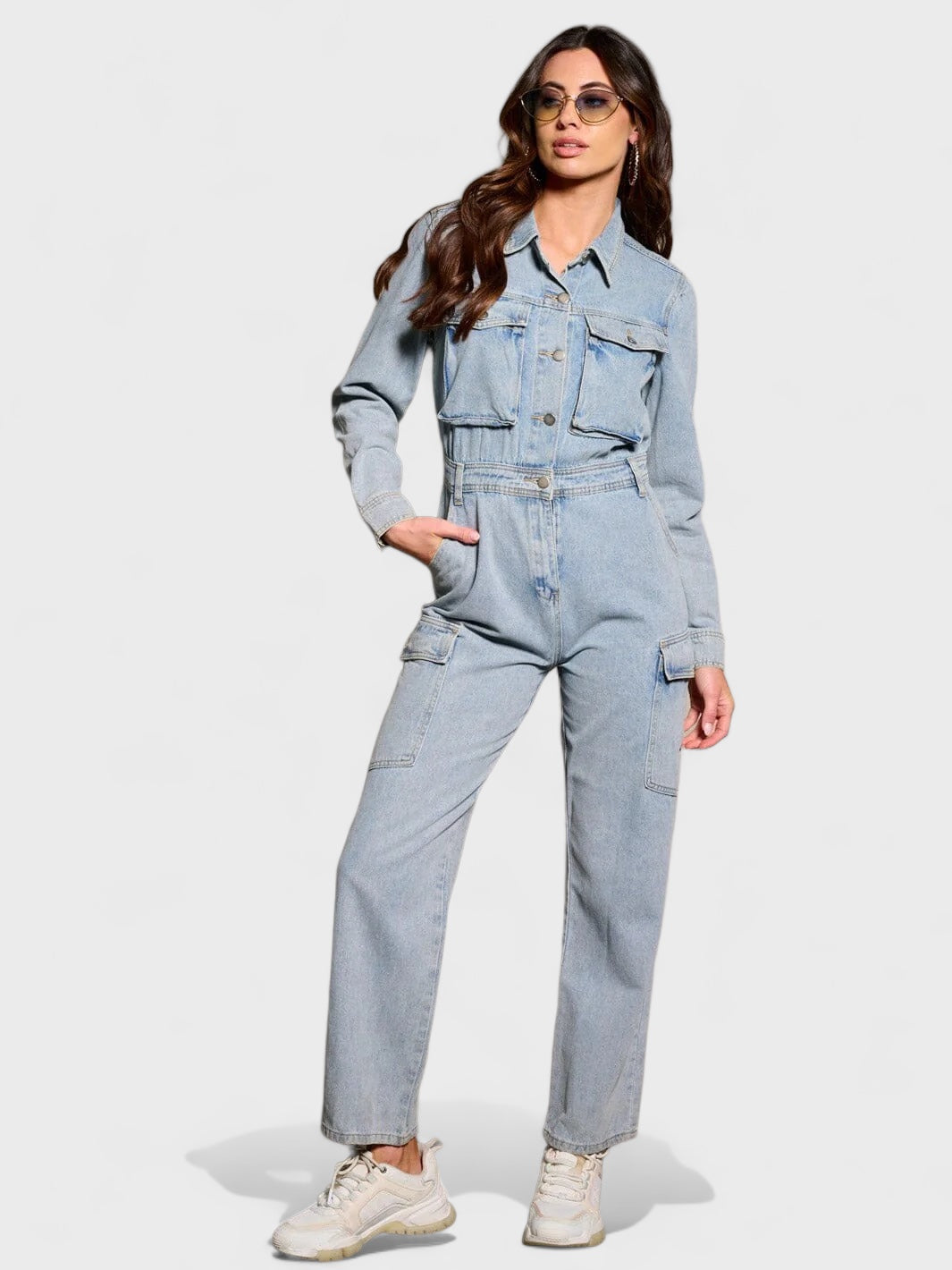 WOMEN'S LONG SLEEVE BUTTON-UP DENIM JUMPSUIT.