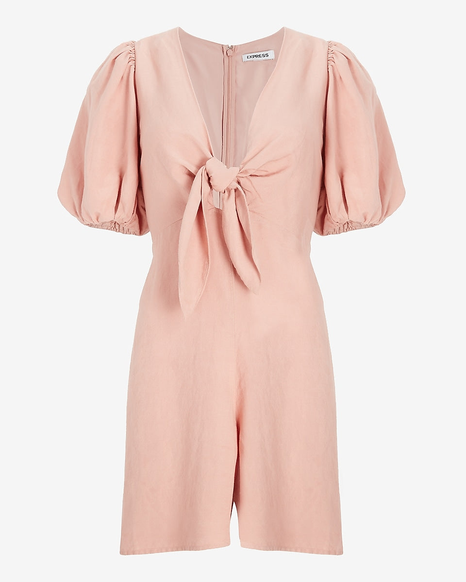 An effortlessly chic romper with puff sleeves and a super slimming fit. This one-and-done piece can be dressed up with heels or kept casual with sandals.