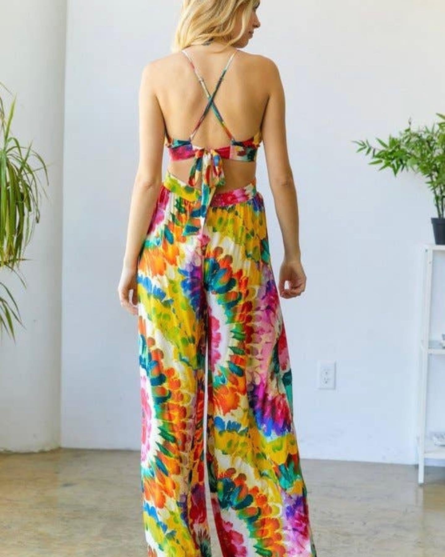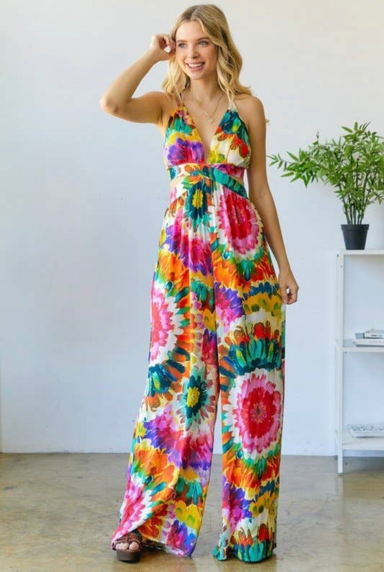 Multi-Colored Tie Dye Jumpsuit. This gorgeous multi-colored dye jumpsuit comes with tie straps on the back and opens on the sides. Wear it with any of your favorite pairs of shoes to complement your outfits and for a splendid look.